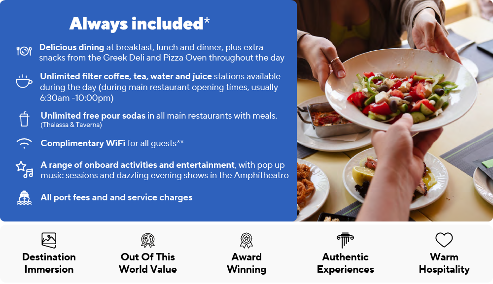 • ~On-board dining at breakfast, lunch and dinner,plus extra snacks from the Greek Deli and Pizza Oven throughout the day
